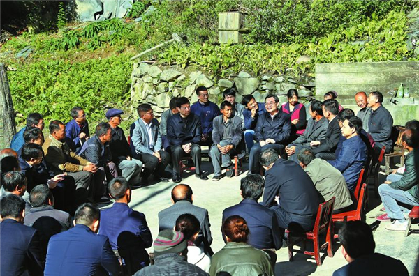 ? (10月10日,省委書記胡和平深入嵐皋縣南宮山鎮西河村,與部分群眾及鎮村干部進行座談,了解扶貧工作進展,聽取群眾意見建議,與大家一起商討脫貧致富的措施。陜西日報記者 宋紅梅/攝)?