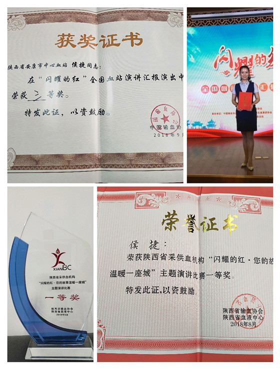 我站血源管理科侯捷同志,根據(jù)自己血站崗位工作成長經(jīng)歷,結(jié)合血源一線招募典型事例,充分展示安康無償獻血招募宣傳模式,以“成長在生命年輪中的信仰”為題,代表安康市中心血站參加陜西省“閃耀的紅--您的故事溫暖一座城”血站系統(tǒng)演講比賽,以獨特的視角和演講效果奪得冠軍,并選派于9月21日代表陜西省采供血行業(yè)參加“閃耀的紅”全國血站演講比賽榮獲三等獎,是我站首次在全省、全國演講比賽中取得的最佳成績,為我站在全國范圍內(nèi)贏得了榮譽,為安康、陜西血站行業(yè)系統(tǒng)爭了光,在全國血液行業(yè)內(nèi)展示了我站職工昂揚向上的精神風(fēng)貌。
