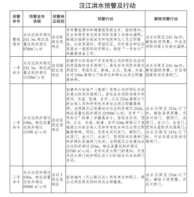根據《安康市人民政府關于印發(fā)安康城區(qū)防汛抗洪預案的通知》有關漢江洪水預警及行動的內容: