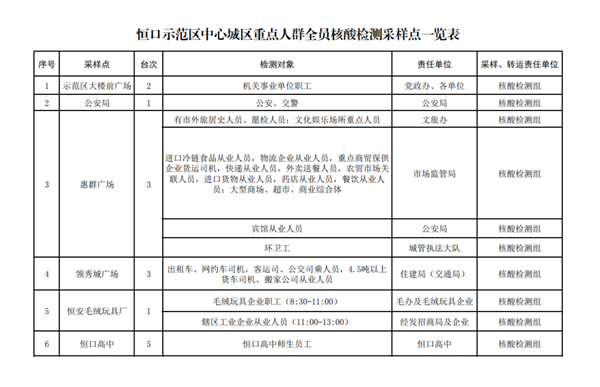 按行業、類別、區域,共設置19個采樣點、40個采樣臺(見附件),具體由各行業牽頭部門、責任單位統一安排采樣點設置、人員組織、秩序維護,檢測對象按照牽頭部門、責任單位的具體要求,分時段有序到指定地點進行采樣,避免人群聚集。