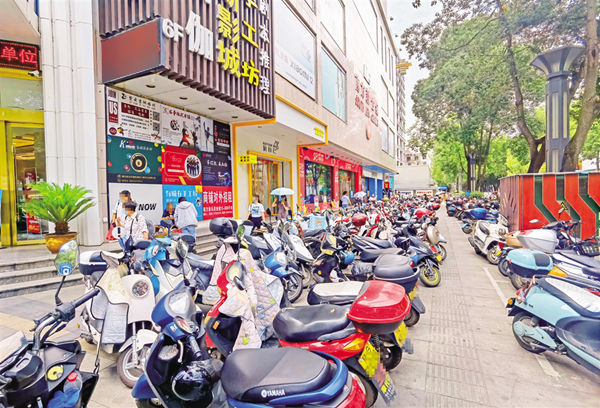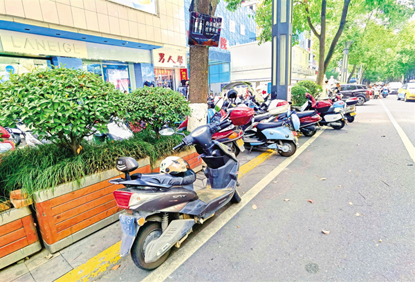 6月18日,在安康城區金州南路人行道上,部分車輛占用盲道、車身超出停車線(圖1),未按要求停放車輛(圖2),造成了安全隱患。(記者 張喬 攝)