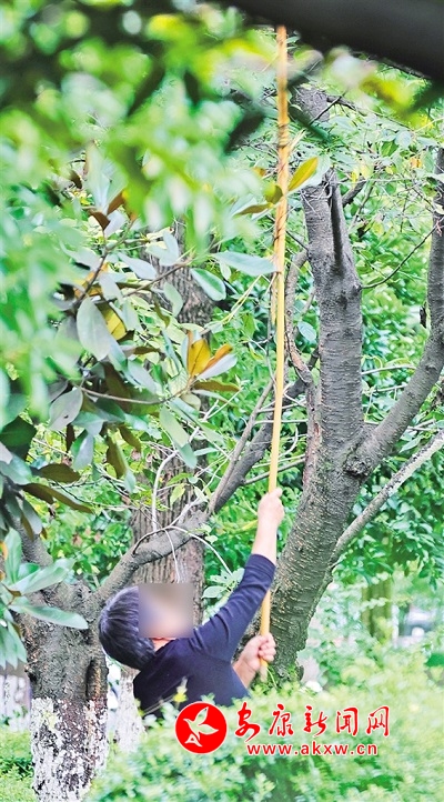 市民拿著長桿在景區附近采摘果實