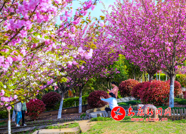 近日,在漢陰縣龍崗公園,成片櫻花競(jìng)相開(kāi)放,形成一片紅粉為主、白色點(diǎn)綴的爛漫花海,蔚為壯觀。