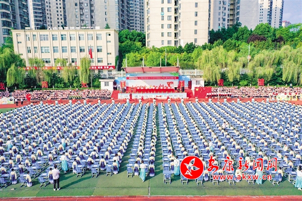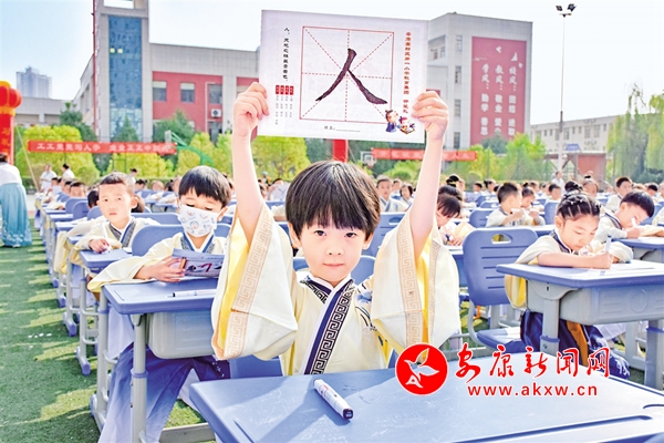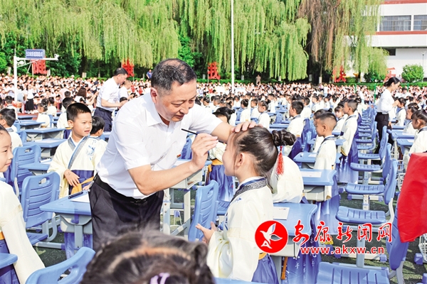 為傳承中國傳統文化,進一步加強學生文明禮儀教育,日前,安康高新區第一小學舉行一年級新生開筆禮及優秀學生表彰活動。千名一年級蒙童身著漢服,由班主任帶領跨過啟蒙門,正衣冠、感恩鞠躬、朱砂啟智、擊鼓明志、開筆啟蒙,接受中國傳統文化的洗禮,領略傳統文化的魅力。(張凌云 攝)