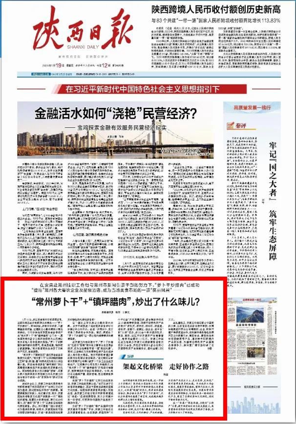 1月19日《陜西日報》頭版刊發文章《“常州蘿卜干”+“鎮坪臘肉”,炒出了什么味兒?》,報道鎮坪縣聯手常州市以文化賦能“土特產”,讓蘇陜協作更出彩!