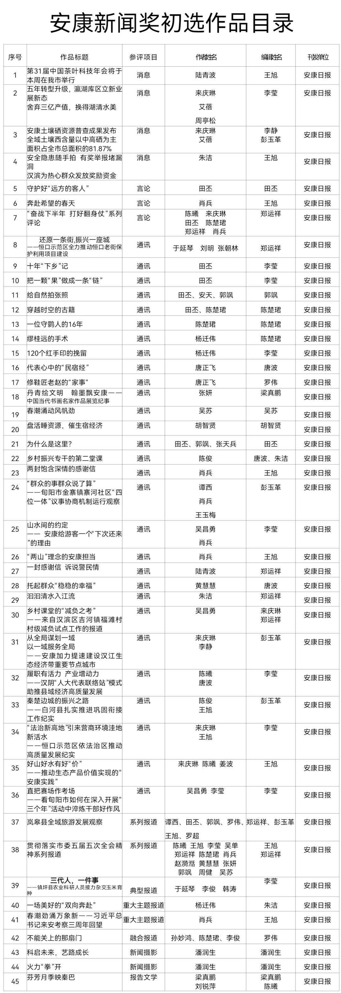 經過3月20日編委會推薦、社黨委研究決定,擬推薦以下45件新聞作品參評2023年度“安康新聞獎”。公示時間從2024年3月21日至2024年3月27日,公示期5個工作日。如有不同意見,請向安康日報社機關紀委、新聞管理部反映。