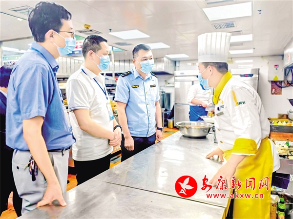 “五一”假日將至,漢濱區(qū)紀(jì)委監(jiān)委會同市場監(jiān)督管理部門對中心城區(qū)酒店餐飲服務(wù)場所開展監(jiān)督檢查。圖為檢查組在某酒店后廚了解情況。鄭時(shí)根 攝