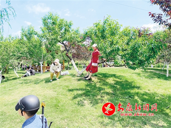 5月5日,在安康高新區桃花源景區內存在不文明旅游現象,一游客靠坐在桃花樹干上拍照。胡波 攝