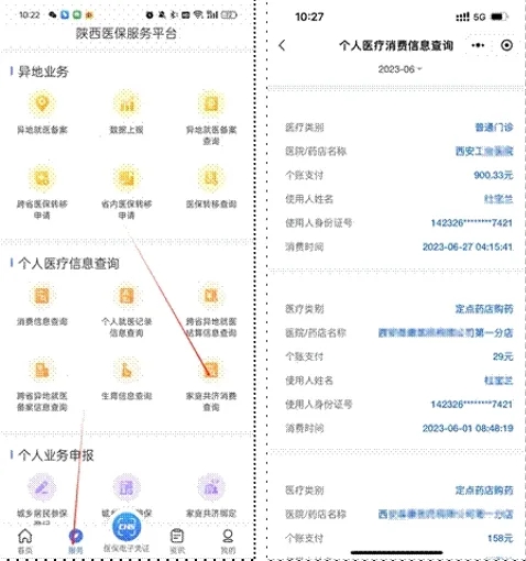 在“陜西醫保”APP“服務”界面,選擇家庭共濟消費查詢功能,授權者可查詢到使用者的家庭共濟消費情況。