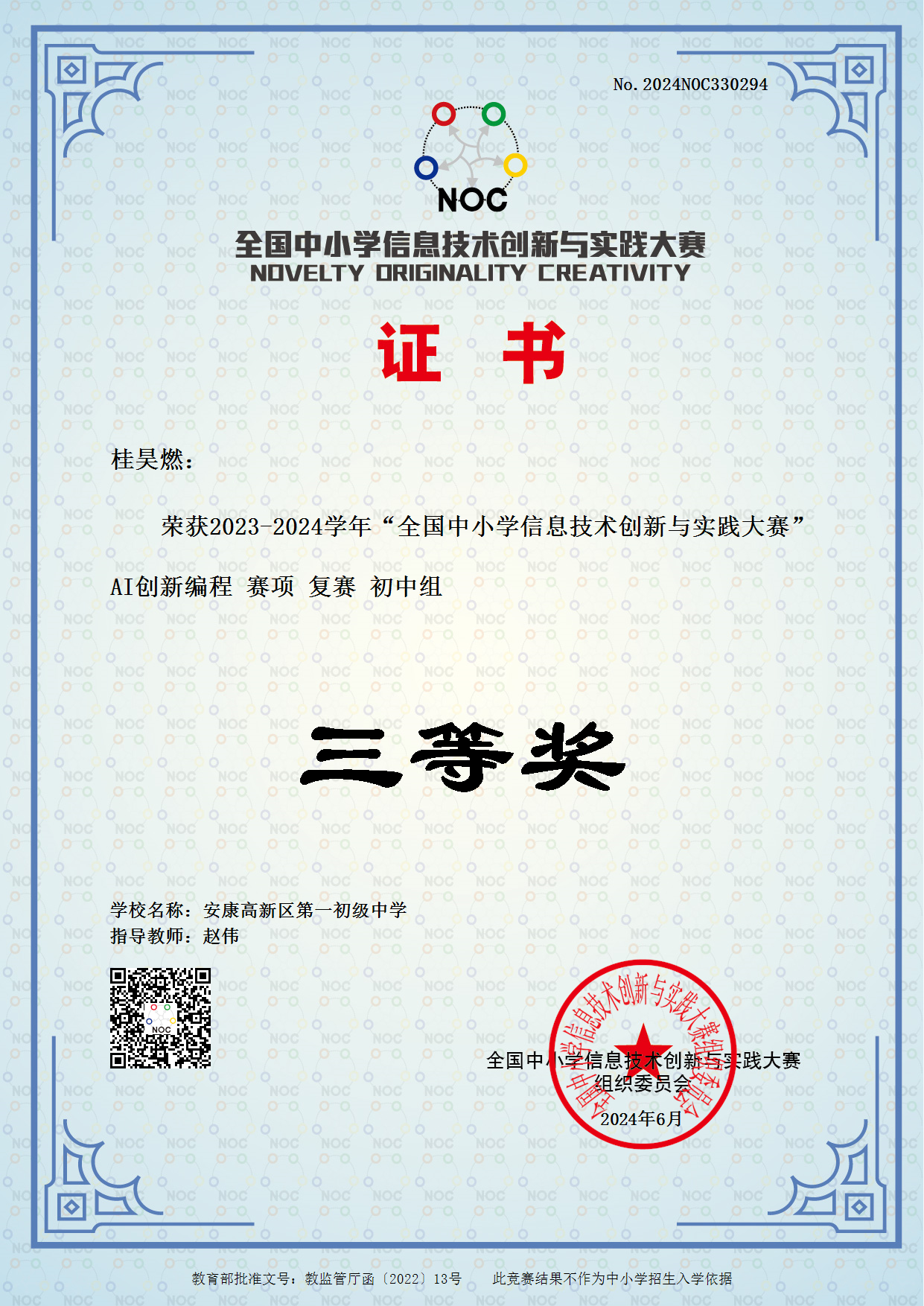 本網訊(通訊員 趙偉)近日,高新區第一初級中學桂昊燃同學在全國中小學信息技術創新與實踐大賽復賽中榮獲三等獎,該生由趙偉老師指導。