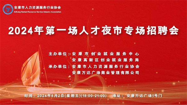 為有效保障企業用工需求,促進未就業高校畢業生、退役軍人、城鎮失業人員、返鄉農民工等各類人員就業,安康市創業就業服務中心、安康高新區創業就業服務局定于2024年8月2日(星期五)在安康高新區萬達廣場1號門舉辦2024年第一場人才夜市專場招聘會,現將活動事項公告如下: