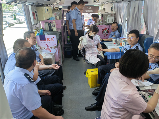 活動現場,參與獻血的公安干警們早早來到獻血點,在醫護人員的指導下,認真填寫獻血登記表,依次接受健康征詢、血液初篩檢查、現場采血等流程。鮮紅的熱血順著導管緩緩流出,匯聚成了一份份愛心,每個人的臉上都洋溢著堅定和自豪。