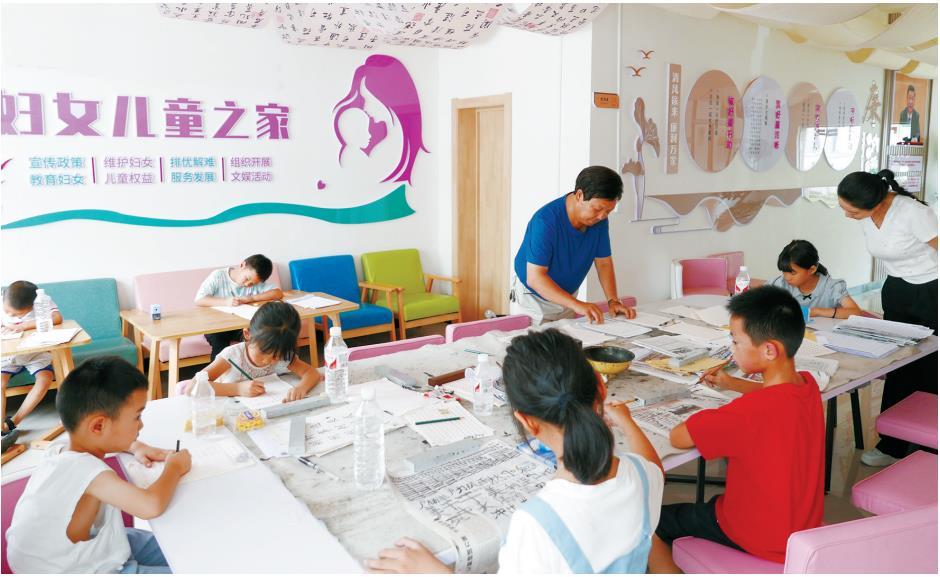 與此同時,在聯合子中心的書法教室,數名兒童端端正正地坐在書桌前練習書法。“指實掌虛、豎掌平腕、心正則筆正……”聯合子中心管理員彭長明在一旁給孩子們指導。