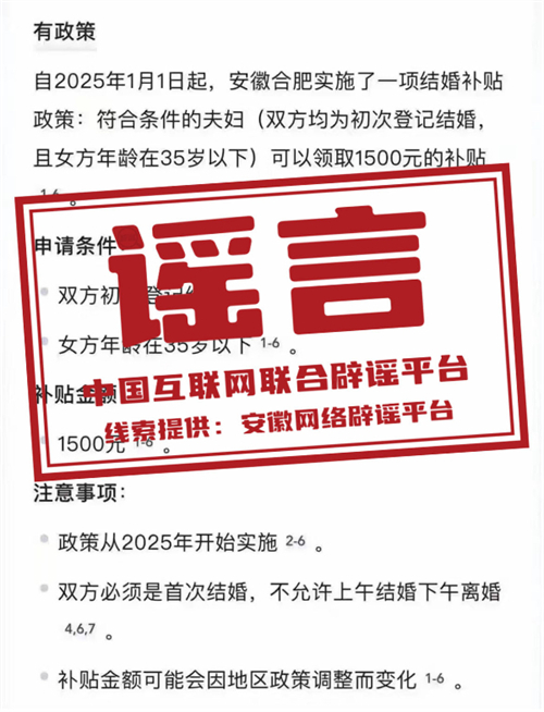 真相:近日,有網民發布消息稱“自2025年1月1日起,安徽合肥實施結婚補貼政策”“初次結婚登記可以領取1500元補貼”“下載相關APP即可領補貼款”,引發關注。對此,合肥市民政局發布聲明稱,網傳消息為謠言。合肥市并未研究、出臺有關結婚登記的補貼政策,望廣大網民注意甄別。(來源:“安徽省互聯網違法和不良信息舉報”微信公眾號)