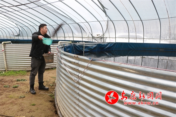 雙龍社區(qū)東糧和諧養(yǎng)殖農民專業(yè)合作社負責人劉東糧正在喂魚