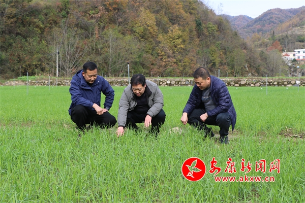 大河鎮(zhèn)先鋒社區(qū)第一書記馬鵬和市區(qū)農技中心的專家在進行冬小麥品種試驗