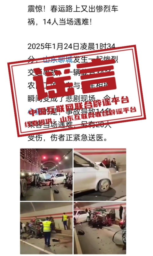 真相:近日,有網民在網絡平臺發布一則“山東聊城一隧道內發生多車相撞”的信息,稱“現場多車發生嚴重碰撞,場面慘烈,群眾滯留”,引發關注。經當地警方核實,山東省聊城市從未發生過類似交通事故,該信息內容純屬虛假編造。經查,網民褚某某和韓某為博取關注、吸引流量,將外省市發生交通事故的圖片視頻移花接木,稱“聊城發生交通事故”并憑空捏造傷亡人數,造成不良影響。目前,二人已被公安機關依法打擊處理。(來源:山東互聯網聯合辟謠平臺、聊城市網上辟謠平臺)