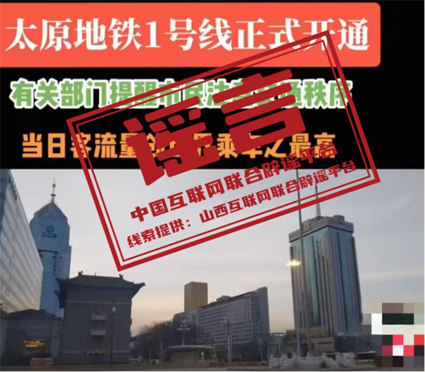 真相:近日,有網民發布短視頻稱“太原地鐵1號線正式開通,有關部門提醒市民注意交通秩序,當日客流量創世界乘車之最高”。經與當地交通部門核實,此信息內容不實。該網民行為違反《網絡信息內容生態治理規定》第六條第八款規定,網信部門已將線索移交公安部門進一步調查處理。(來源:“山西網絡舉報”微信公眾號)