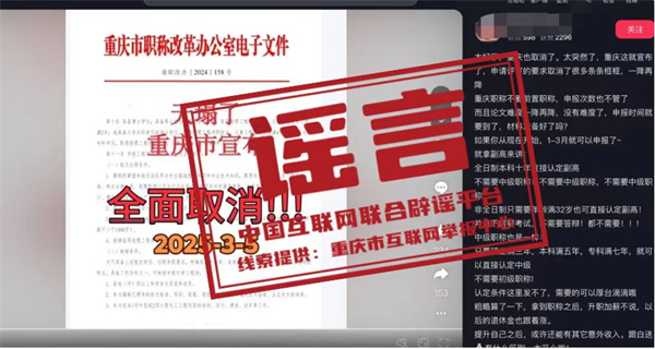 真相:近日,有網民在互聯網平臺發布消息稱“重慶市宣布,申請評審的要求取消了很多條條框框,職稱申請不看前置職稱,全日制本科十年直接認定副高,不需要中級職稱”,引發關注。經核實,網傳信息系謠言。職稱評審均需逐級晉升,取得上一級職稱并滿足相應學歷資歷條件后方可晉升高一級職稱。目前重慶市除特殊人才、博士后等3個針對特定對象的職稱申報綠色通道外,正常申報通道均需逐級晉升。網傳文件是網民通過P圖軟件編輯而成,試圖吸引不明真相的群眾咨詢,借機推銷職稱代辦服務,收取高額費用。目前,謠言線索已轉交公安機關進一步調查處置。(來源:“重慶辟謠”微信公眾號)