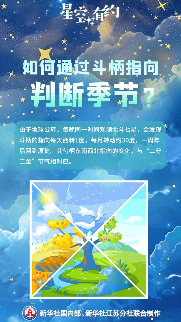 由于地球自轉軸指向北極星方向,從地球上看,北斗七星每天圍繞著北極星做圓周運動。“因此,古人用北斗七星判斷季節的方法相對粗略,適合日落后的入夜時分。隨著時間推移,斗柄的指向會有明顯變化。例如,春季天黑后不久,斗柄大體指向東方,但到午夜就轉向南方,天亮前則指向西方?!蓖蹩瞥f。