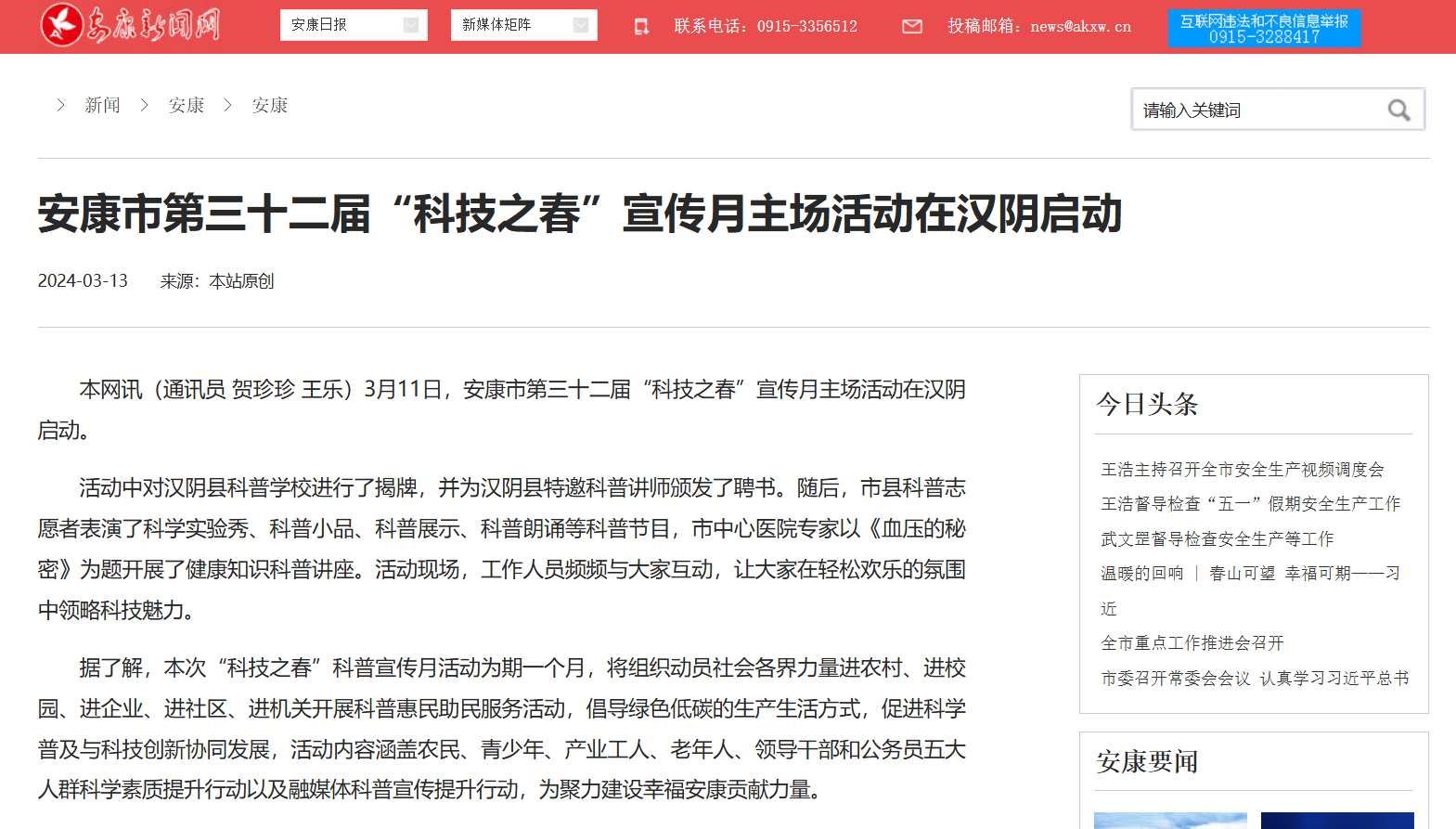 《安康市第三十二屆“科技之春”宣傳月主場活動在漢陰啟動》(2024-03-13發布)