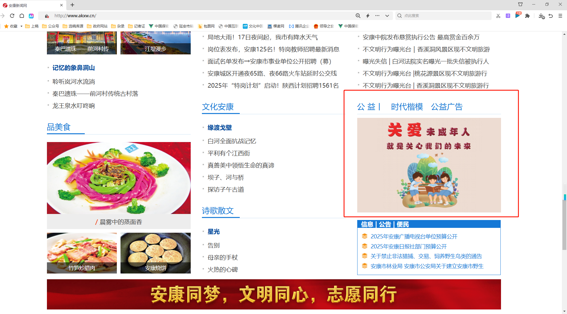 網站首頁設置“公益”模塊,多頻次發布時代楷模、公益創文、道德模范等內容的公益廣告131條。安康新聞網還積極開展支部“三聯”共建,助推鄉村振興,廣泛參與到文明創建、交通志愿服務、義務植樹、文化下基層等公益活動。