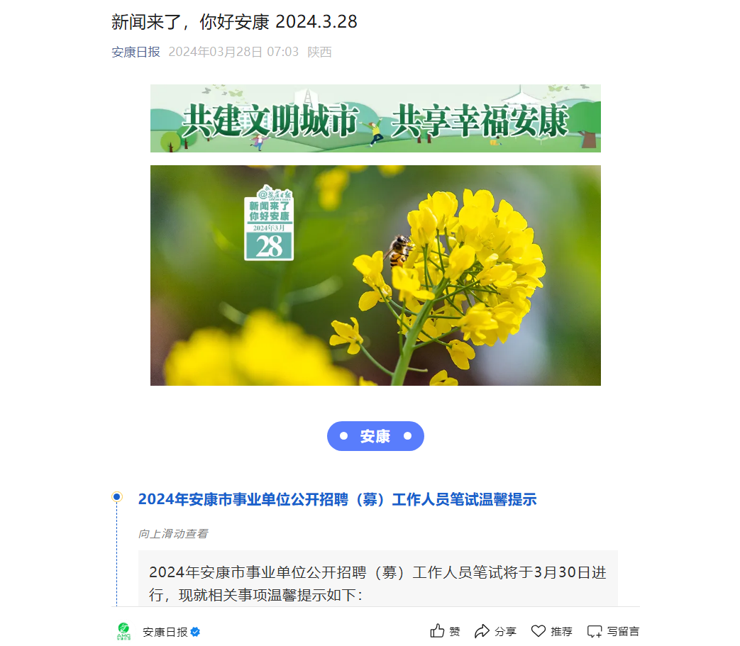 由安康日報社、安康新聞網運維的“安康發布”微信公眾平臺圍繞“聚焦重點政務新聞推送、深化政務公開、做好政策宣傳,助推政務服務”,著力打造政策宣傳、權威可信的內容體系,整體傳播影響力、服務水平和引導能力不斷提升。累計推送推文900余期,推文1400余條,總閱讀次數95.8萬次。堅持民生視角,做強“服務力”,走好“網上群眾路線”,不斷深化完善“政務+服務”理念,圍繞就業就學、交通出行、重要天氣預報等民生消息,科學全面細致做好內容發布。
