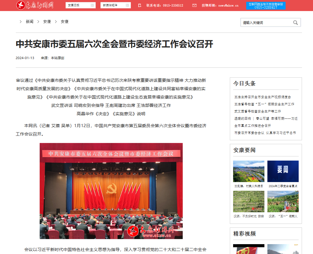 《中共安康市委五屆六次全會暨市委經濟工作會議召開》(2024-01-13發布)