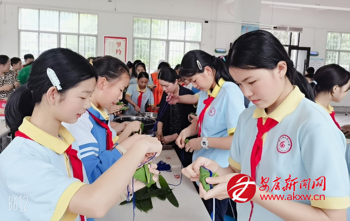 活動現場,老師與家長手把手向學生傳授包粽技巧,從粽葉的折疊角度、糯米的填充分量,到捆扎成形的精細手法,學生們圍坐桌前專注練習。折葉、填米、捆扎……轉眼間一個棱角分明的粽子便成型,現場粽葉翻飛、笑語不斷。活動中,老師們還穿插講解端午習俗,當熱氣騰騰的粽子出鍋時,孩子們捧著軟糯香甜的粽子細細品嘗,在味蕾的享受中感悟傳統文化的深厚底蘊。