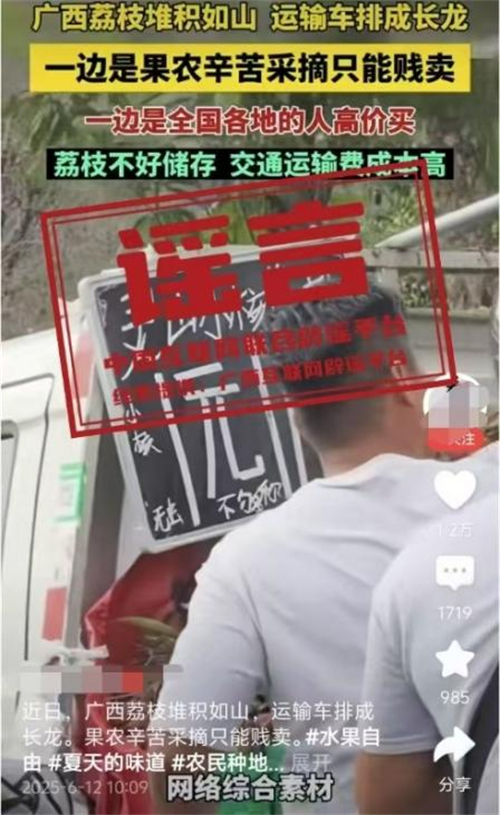 真相:6月12日,網傳“近日廣西荔枝堆積如山,運輸車排成長龍。果農辛苦采摘只能賤賣”的視頻,畫面顯示荔枝堆積和“靈山荔枝1元”字樣。經核查,視頻內容并非發生在靈山縣。目前,靈山荔枝“妃子笑”等中熟品種逐漸批量上市,大規模上市時間為6月20日左右,當前荔枝產銷有序開展,并未發現個別媒體報道的“荔枝滯銷賤賣”“采摘堆積成山”“運輸車排成長龍”的情況,也沒有發現價格低到1元的荔枝出售。(來源:“廣西互聯網違法和不良信息舉報”微信公眾號)