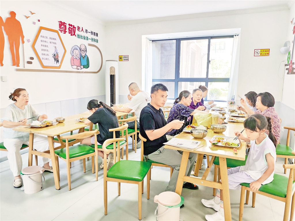 小區的日間照料中心內,用餐區、棋牌室、兒童娛樂室、書法室等一應俱全,是居民們心中溫暖的港灣。70多歲的獨居老人袁興瓊,除每周兩次透析外,幾乎都在中心度過?!笆程蔑埐丝煽冢瑑r格也便宜,菜單每天在微信群更新。我們這些老人過上了放下鍋鏟、直接走向餐桌的好日子,每天還有人陪著聊天,生活很舒坦?!?/p>
