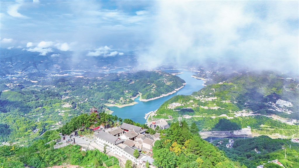 8月14日清晨,站在瀛湖風景區內遠眺,遠山、村莊相互映襯,風景如畫。趙華斌 攝