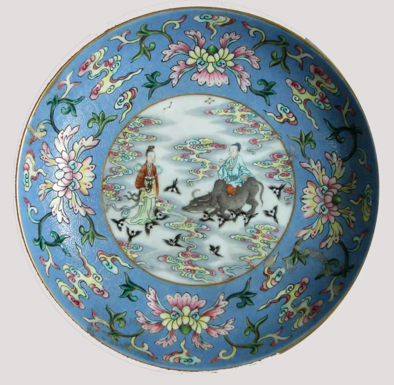 北京藝術(shù)博物館收藏的清代景德鎮(zhèn)官窯粉彩人物圖盤,就像一幅流動(dòng)的七夕畫卷。此盤工藝精湛,口沿涂金,熠熠生輝,盡顯皇家氣派。盤內(nèi)外壁采用“粉彩軋道”工藝,天藍(lán)釉地上淺淺的卷草紋似微風(fēng)輕拂,粉彩花卉與朵云紋相互映襯,如夢(mèng)如幻。盤內(nèi)底描金圓形開(kāi)光處,粉彩繪就的人物故事圖案更為生動(dòng):牛郎坐于牛背,手握韁繩,深情凝望;織女身姿婀娜,嬌羞回望,二人似在互訴衷腸。背景中祥云繚繞、星辰閃爍、鵲鳥紛飛,為這場(chǎng)相會(huì)營(yíng)造了浪漫的氛圍。外底“鵲橋仙渡”四字,點(diǎn)明主題。