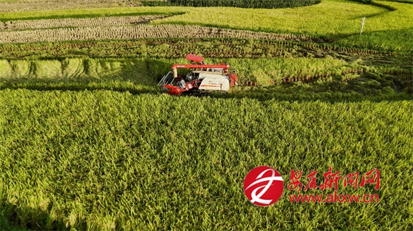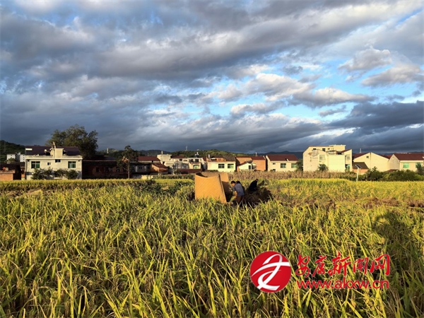 走進新河村,陽光灑在沉甸甸的稻穗上,飽滿的谷粒泛著金黃光澤。微風拂過,連片稻田掀起層層稻浪,裹挾著清新的谷物香氣彌漫田間。稻田里,農機手熟練地操控著收割機,在田間來回穿梭,機身所過之處,水稻快速完成脫粒、秸稈分離,金黃的稻谷源源不斷送入機倉,實現顆粒歸倉;為進一步加快水稻收割進度,幾位村民則支起拌桶,手持稻把用力拍打,沿用傳統打谷技藝同步搶收,機器轟鳴聲、打谷聲與村民的歡聲笑語交織成秋日豐收的“協奏曲”。