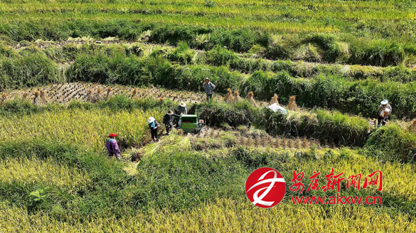金秋時節,漢陰縣鳳堰梯田景區迎來了一年中最動人的季節。層層疊疊的梯田上,稻穗低垂、金黃遍野,農戶們穿梭其間,描繪出一幅忙碌而喜悅的豐收畫卷。