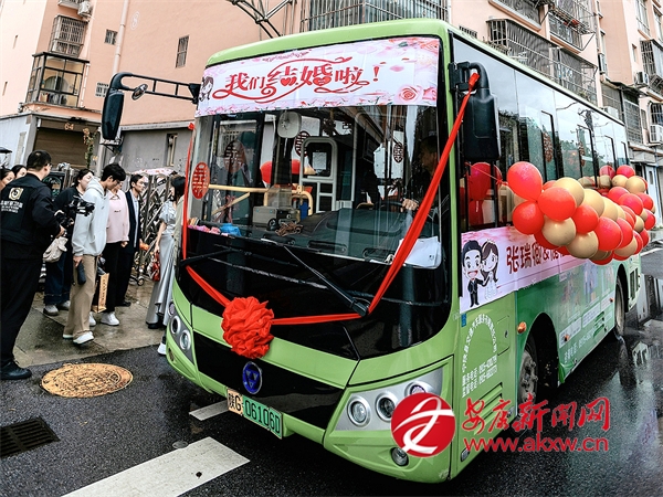 為了讓公交車更有“婚禮氛圍”,新郎、新娘和親友們一起用氣球、飾品和貼畫對車廂進行了簡單裝飾,既溫馨又不浮夸。10月4日迎親當天,精心裝飾的婚車準時到達目的地。橫幅海報“我們結婚啦”與紅繡球貼在公交車頭,氣球貼滿車身,將接親的儀式感“拉滿”。新郎、新娘在眾多親朋好友的陪伴下,一起登上這輛“專車”,駛向名為“幸?!钡南乱徽尽\噹麅?,互動節目層出不窮,祝福歌聲不斷,一路歡聲笑語。車窗外,不少市民看到這獨特的“婚車”,紛紛拿出手機拍照,揮手送上祝福。