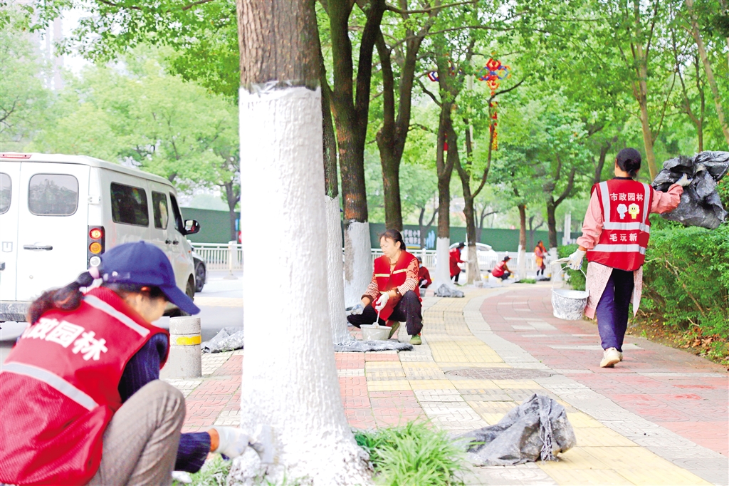 “刷白不是簡(jiǎn)單的涂涂畫(huà)畫(huà),得兼顧效果與顏值。”現(xiàn)場(chǎng)管護(hù)負(fù)責(zé)人周宏安介紹,作業(yè)中嚴(yán)格執(zhí)行統(tǒng)一標(biāo)準(zhǔn),采用涂白劑、石硫合劑、水按20∶1∶10配比的藥劑,在每棵樹(shù)上標(biāo)定基準(zhǔn)線,確保涂白高度控制在1米至1.2米之間,做到上口平齊、下不露“腳”。針對(duì)樹(shù)皮縫隙、孔洞等關(guān)鍵部位,工人們反復(fù)涂刷,同時(shí)全程做好防護(hù),避免藥劑外濺污染路面與樹(shù)穴,實(shí)現(xiàn)“防護(hù)到位、環(huán)境整潔”雙重目標(biāo)。