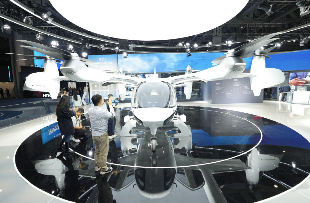 2025年11月5日在第八屆進博會汽車及智慧出行展區拍攝的時的科技E20 eVTOL(電動垂直起降飛行器)。在第八屆進博會上,一批新型移動出行產品與創新技術集中亮相。從智能駕駛到低空出行,從新能源解決方案到人性化設計……一幅多元化、立體化的未來出行圖景正徐徐展開。
