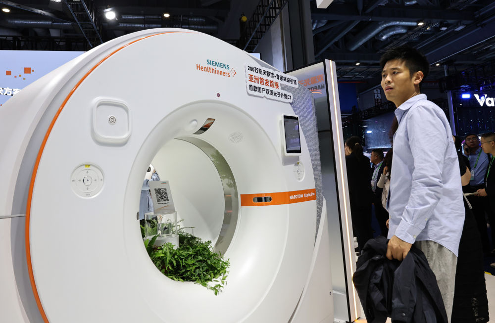 2025年11月6日,參觀者在第八屆進博會醫療器械及醫藥保健展區西門子醫療展臺駐足觀看一款亞洲首發首展的CT機展品。進博會是全球新品首發地,更被視為前沿技術“首秀地”。