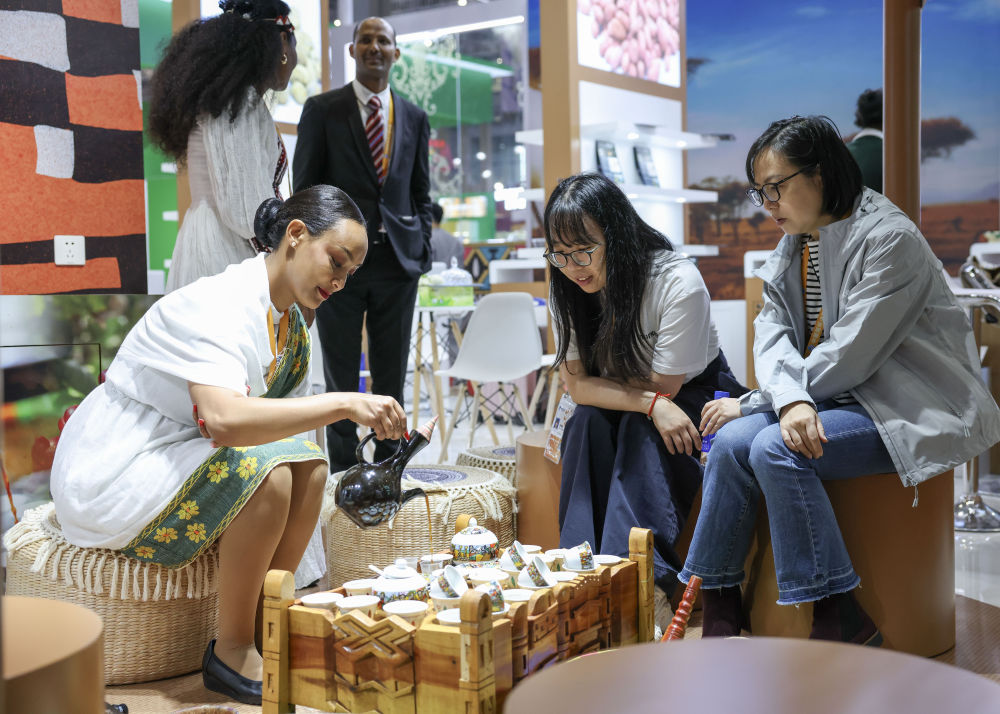 2025年11月7日,人們在第八屆進博會國家展埃塞俄比亞館品嘗咖啡。本屆進博會上,共有來自123個共建“一帶一路”國家的企業參展,同比增長23.1%;來自最不發達國家的企業達163家,同比增長23.5%。自首屆起,進博會便為最不發達國家提供免費標準展位。本屆進博會首次為最不發達國家產品打造專區,擴容非洲產品專區,支持非洲建交國用足用好100%稅目產品零關稅政策,非洲企業參展數量同比增長80%。