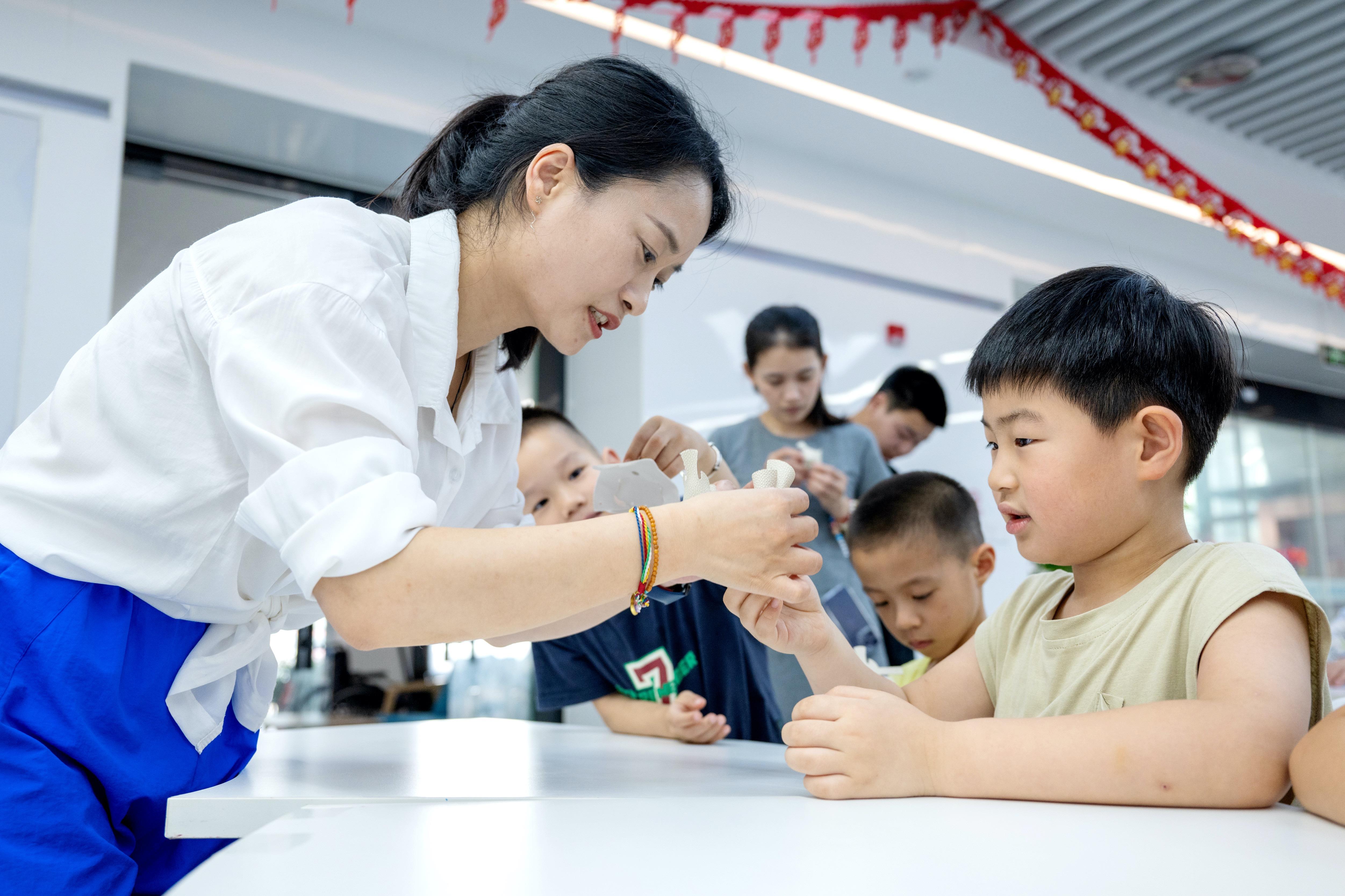 △2025年7月3日,浙江湖州長興縣龍山街道齊北社區(qū)幸福鄰里中心,志愿者指導孩子們制作手工。