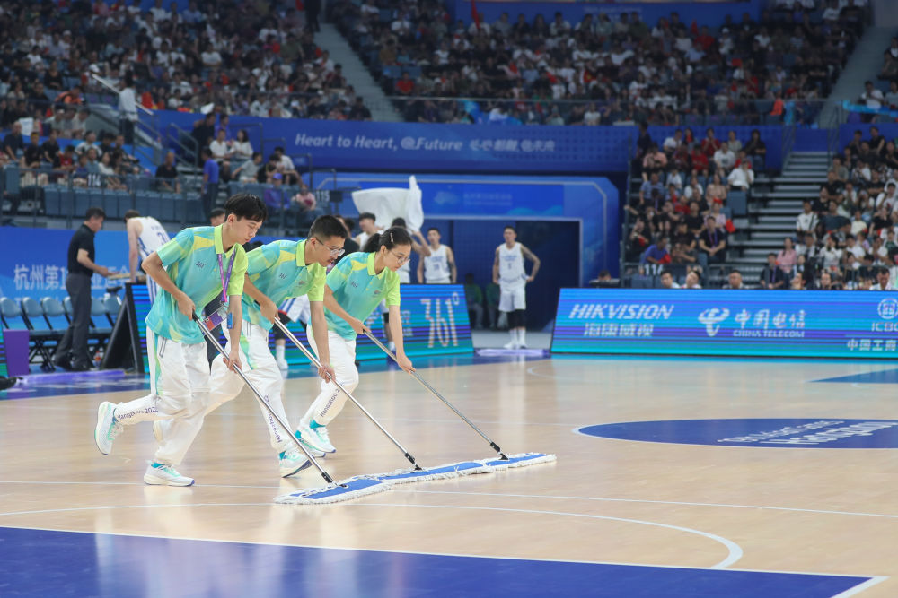 ??2023年9月28日,杭州亞運會志愿者“小青荷”在杭州亞運會籃球男子預賽B組比賽前清潔場地。從2016年二十國集團領導人杭州峰會以來,“小青荷”這一志愿服務工作品牌已成為杭州大型賽會服務的一張金名片。
