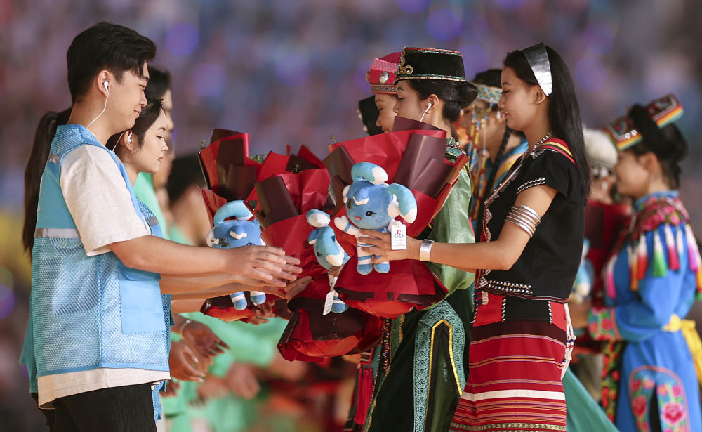 ??2024年11月30日,五十六個民族代表在海南三亞舉行的第十二屆全國少數民族傳統體育運動會閉幕式上為志愿者獻花。運動會期間,數千名志愿者“小鹿鹿”奔赴十余個競賽場館、二十多家接待酒店、媒體中心、機場車站等地,為來自全國各地的運動員、技術官員、工作人員和觀眾提供禮賓接待、交通引導、安全保衛等志愿服務。