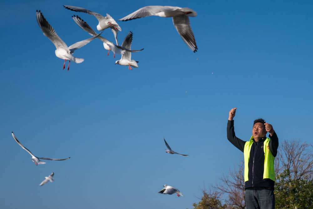 ??2024年12月11日,志愿者張利云在云南昆明王官濕地公園投喂紅嘴鷗。志愿者張利云堅持投喂紅嘴鷗長達十余年,為生態環境保護貢獻個人力量。