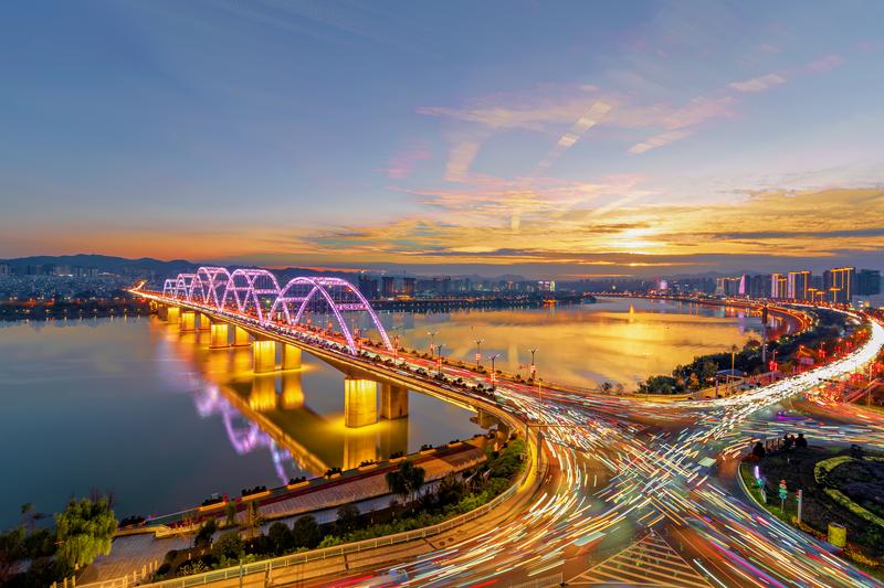 夕陽下的東壩漢江大橋流光溢彩。近年來,我市不斷優化城市路網,市民出行更加便捷,城市交通更加順暢。 皮勇維 攝