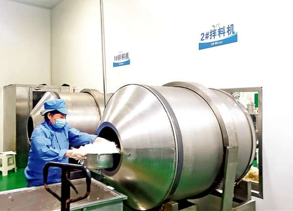 走進五里工業集中區富硒食品產業園的陜西安康悠源食品有限公司(以下簡稱“悠源公司”),呈現出一派生產加工繁忙的景象。在調味間,調味師張萍一絲不茍地稱量、拌料。根據不同產品,她將食鹽、白糖等各種調味品嚴格按比例加入。“就和在家做菜是一樣的,干凈衛生是基礎。還要把味調好,大家才愿意吃。”張萍說。