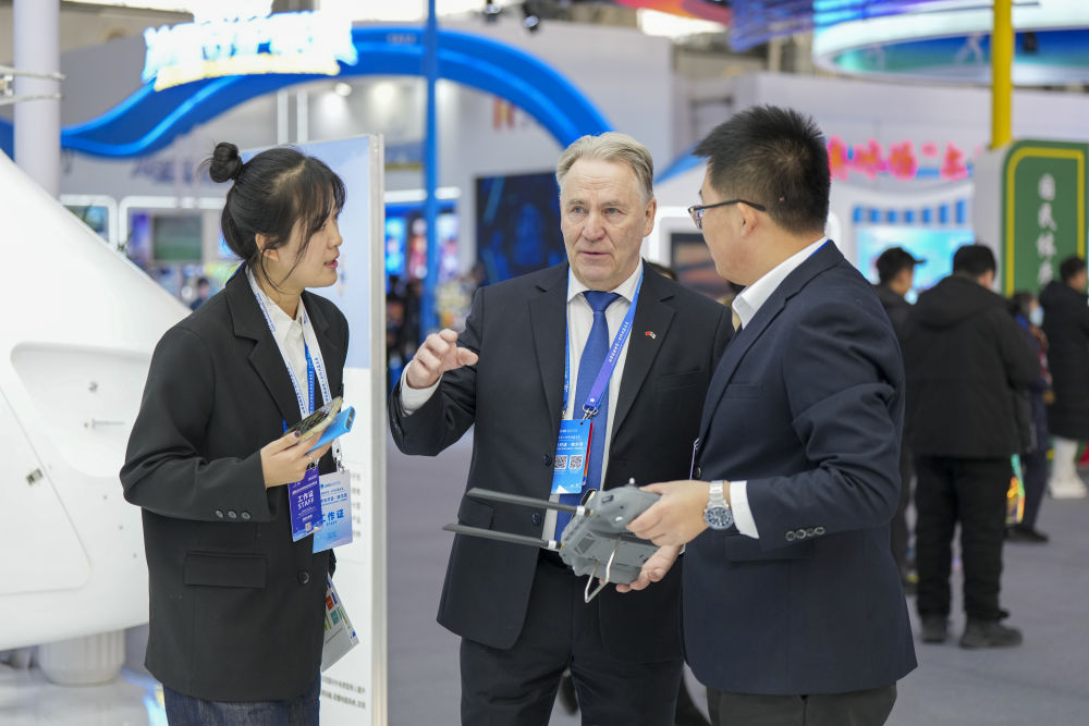 1月6日,在2026哈爾濱國際冰雪經濟博覽會現場,參會嘉賓(中)在了解一款工業無人機的參數和性能。新華社記者 王松 攝