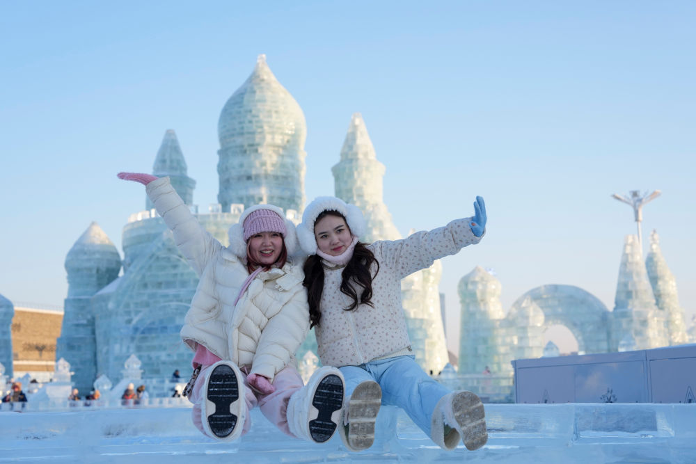 在哈爾濱冰雪大世界,來自世界各地的游客在“冰雪王國”感受冬日限定快樂。