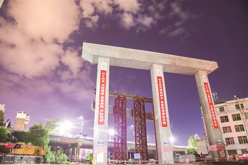 2024年8月8日,七里溝立交首榀鋼箱梁架設(shè)完成。