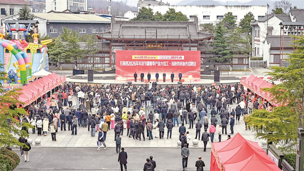石泉縣2026年年貨節(jié)暨春季產(chǎn)業(yè)大招工·蘇陜勞務協(xié)作招聘會啟動儀式近日在秦巴風情園舉行。本次活動創(chuàng)新融合“春風行動”招聘會、年貨節(jié)與文旅促銷,吸引了縣內(nèi)外210余家重點企業(yè)參與,集中提供4500個優(yōu)質(zhì)崗位,旨在促進就業(yè)與消費,助力縣域經(jīng)濟發(fā)展。(董長松 攝)